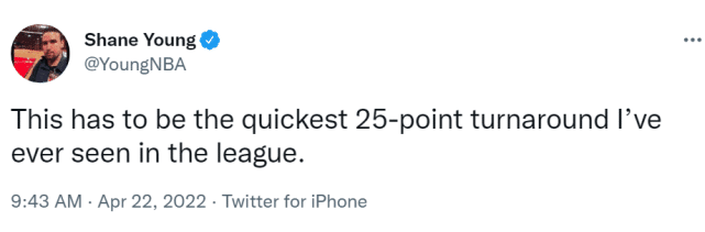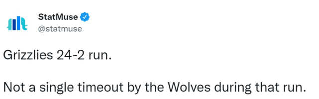 距离第三节结束还有3分10秒时,森林狼79-54领先25分,而第四节刚开始3分27秒时,琼斯三分命中,灰熊83-83追平了森林狼!名记肖恩-杨感慨,这是自己有史以来见过最快的25分逆转,美媒StatMuse吐槽森林狼主帅,被对手打出24-2的过程中,竟然没有喊任何暂停!