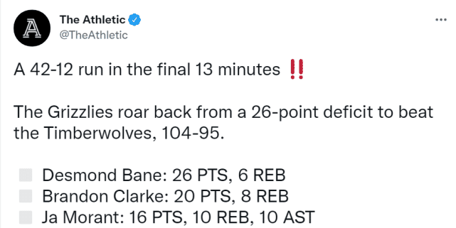 The Athletic指出,灰熊最后13分钟,打出了一波42-12的高潮,彻底完成了这次奇迹!贝恩26分6篮板,克拉克20分8篮板,莫兰特16分10篮板10助攻!