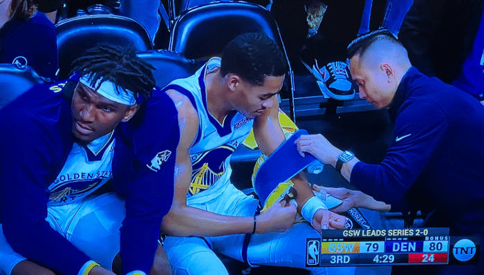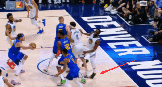 这是第三节进行到还剩下7分20秒的时候,戈登补篮得分,追梦格林倒地不起。慢动作显示,追梦格林是在防守回合时,踩到了队友克莱的脚,他扭伤了脚踝。之后被搀扶离场,不过好在追梦格林问题不大,他轻伤不下火线,暂停之后直接返回比赛带伤出战。