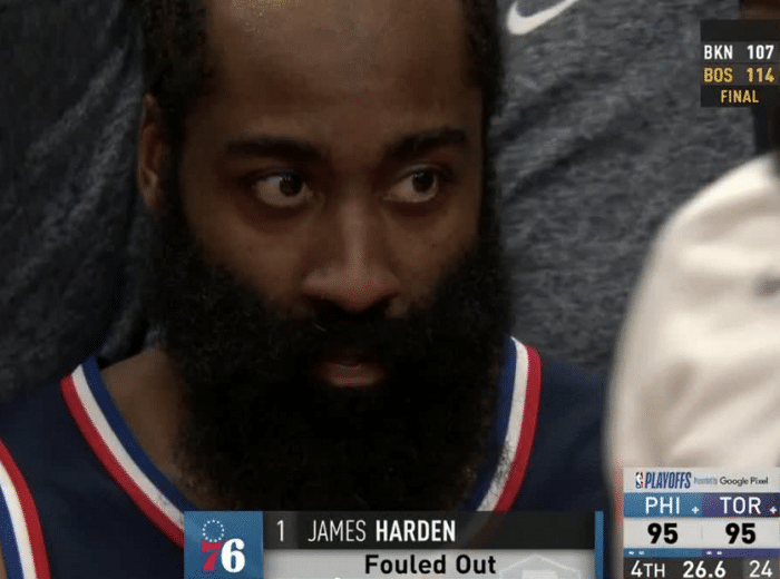 第四节,短暂休息之后,哈登助攻里德暴扣。阿奴诺比造犯规,哈登身背5次犯规。最后还剩下4分41秒,决战时刻哈登出战,紧接着哈登就助攻格林大空位三分命中,还是24秒压哨投进,相当关键。哈登助攻马克西抛投打进,随后他上篮被阿奴诺比干扰球,紧接着哈登造成范弗利特犯规,他两罚中一。哈登拼到6犯下场,很无奈。