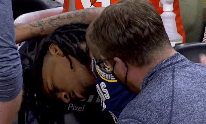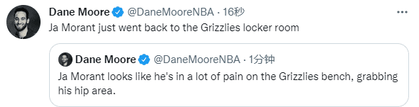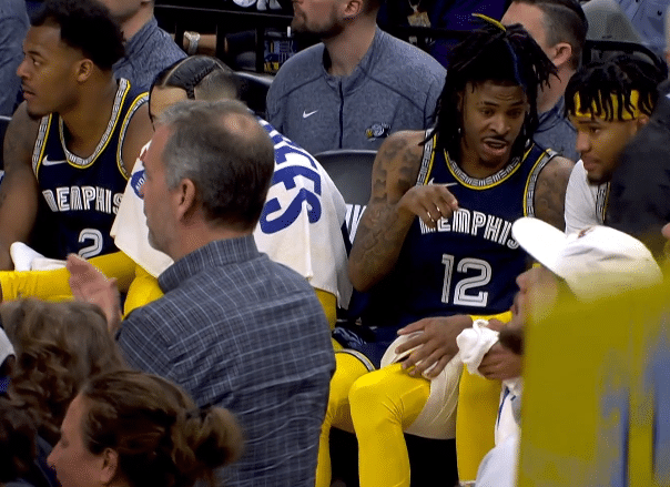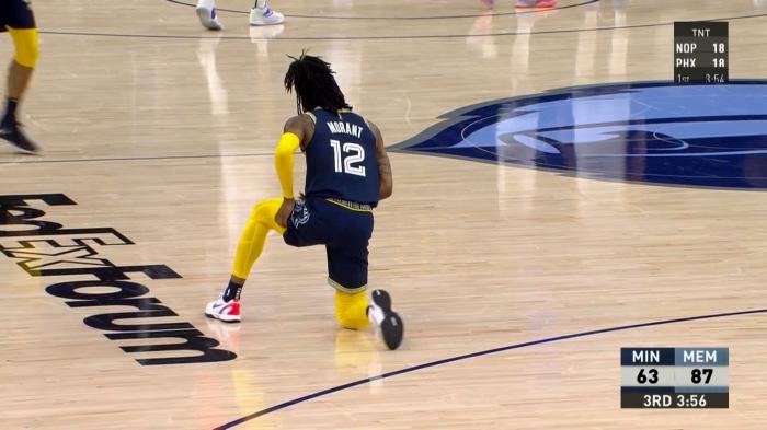 第三节3分35秒,莫兰特在防守时被唐斯撞到大腿,之后莫兰特捂着大腿十分痛苦,单膝跪地太难受;莫兰特坐回替补席,一脸痛苦的表情,缓了一会后,莫兰特跑回更衣室,希望莫兰特的大腿伤势无碍,这一下,被唐斯撞得太狠。