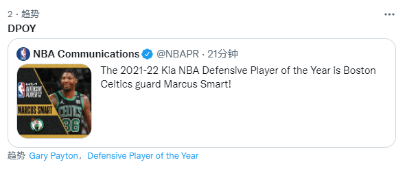 本赛季常规赛,斯玛特场均得到12.1分3.8篮板5.9助攻1.7抢断,斯玛特夺得DPOY瞬间冲上热搜引热议,爵士主帅恭喜斯玛特:斯玛特无疑在场上展示出了极佳领导力和坚韧度,恭喜斯玛特。我想戈贝尔可能会当选季后赛最佳防守球员。