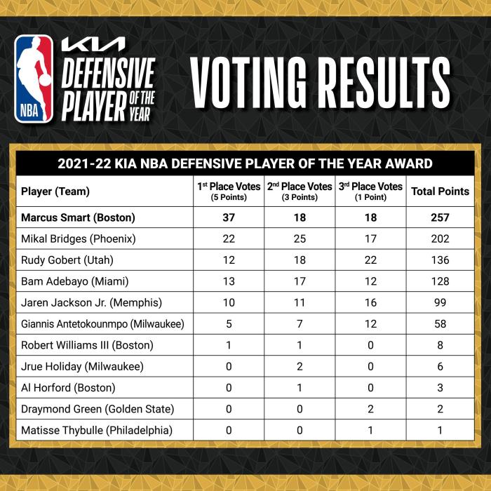 斯玛特获得37张第一选票、18张第二选票和18张第三选票,总共257分排名联盟第一;布里奇斯获得22张第一选票,总共202分排名第二;戈贝尔12张第一选票总共136分,阿德巴约128分,小杰克逊99分,字母哥58分,罗威8分,雄鹿霍乐迪6分,霍福德3分,勇士格林2分和塞布尔1分。