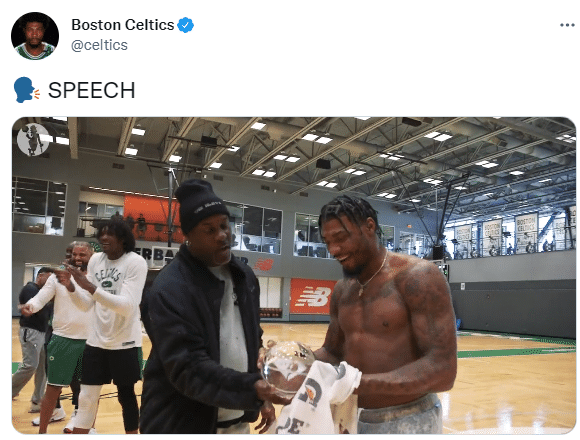 加里-佩顿亲自为斯玛特颁发DPOY奖项,斯玛特赤膊领奖并且发表获奖感言,凯尔特人众球员为他鼓掌、欢呼以及泼水庆祝;凯尔特人官方晒照庆祝,并且把头像换成了斯玛特的头像。