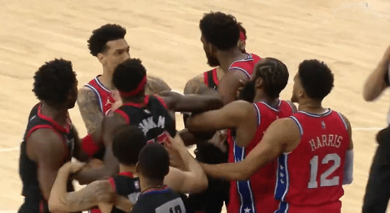 76人和猛龙系列赛G2火药味十足,开场仅打88秒就爆发冲突;之后西亚卡姆凶狠放倒恩比德,裁判回放之后并没有升级为恶意犯规。