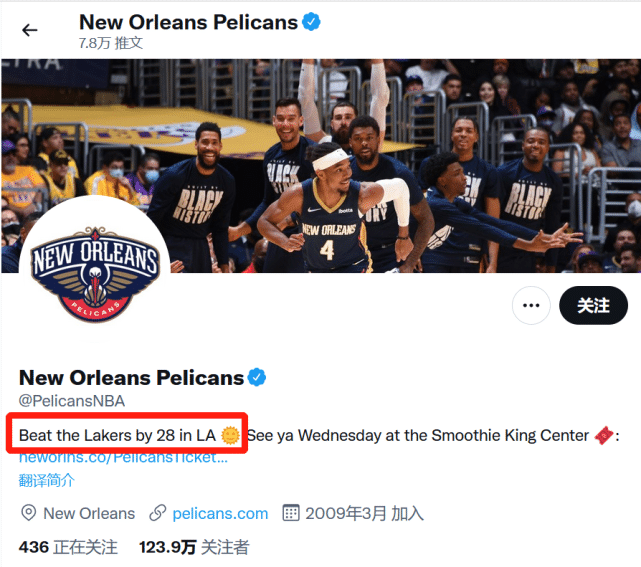 此前两次战胜湖人,鹈鹕官推也都更改了简介。第一次交锋,鹈鹕28分大胜湖人,当时他们把简介改成了“在洛杉矶以28分击败湖人队 ,期待周四与你在冰沙王中心相见!”第二次交锋,鹈鹕完成23分逆转,他们写道“从落后23分到击败湖人!”