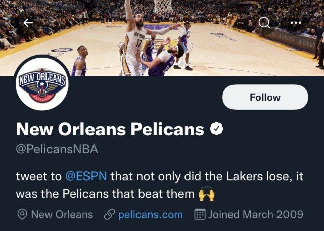 在4月2日时,鹈鹕曾114-111击败湖人,本赛季三杀对手。三杀湖人的喜悦,让当时鹈鹕官推在简介上做文章,对湖人进行了疯狂的嘲讽。当时鹈鹕官推更改简介道:“告诉ESPN,不只是湖人输掉了比赛,而是鹈鹕打败了他们!”这番话霸气十足,作为本赛季湖人的苦主,鹈鹕也确实有资本说出这样的话。