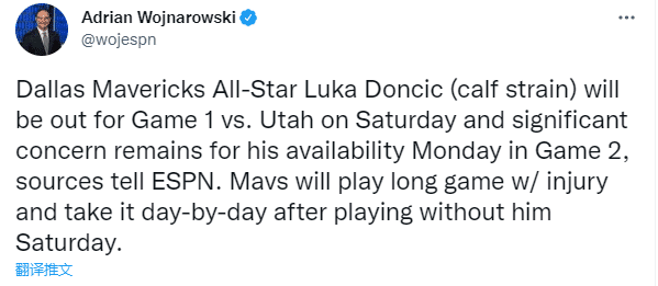 独行侠官方把东契奇的出战状态列为大概率缺席G1,名记沃纳罗斯基则确认东契奇因伤缺席与爵士的第一场比赛,G2能否出战同样值得担忧,在G1之后,他会进入每日观察名单。