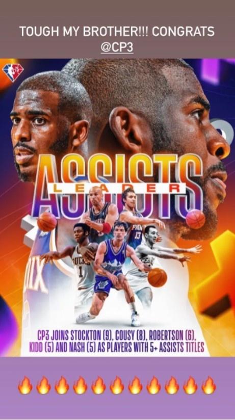 詹姆斯还恭喜保罗再次夺得联盟助攻王,晒照并且配文:强硬啊,我的兄弟!祝贺@克里斯-保罗。
