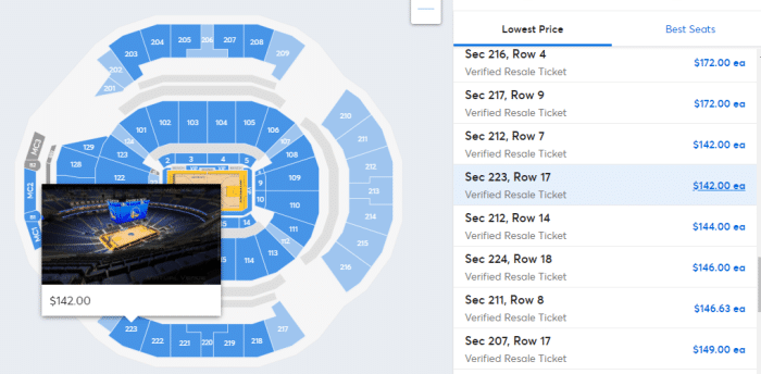 勇士主场最远端,也就是最外围的票价,这些位置的票价比较低,最低是142美元,折合成人民币大概是905元;目前还不清楚勇士主场G1的平均票价,但勇士主场能够容纳18000名球迷,很明显,这又是一场靠门票狂赚几千万美元的比赛。