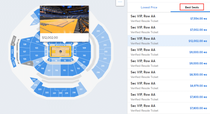 从勇士官方售票平台可以看出,勇士主场最贵票价超过1.2万美元,场边的VIP座位是12002美元/每人,折合成人民币大概是76554元;还要一些场边座位的票价是9000美元、8500美元、7800美元以及6000美元不等的价格;第二排的票价明显下降不少。