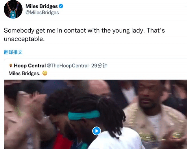 于是他在社交媒体上转发了自己砸人的视频,并且公开道歉表示:“帮我联系一下这位年轻女士,这是不可接受的。”不过毫无疑问,不管布里奇斯怎么弥补过错,他肯定会招致NBA的重罚。因为这已经上升到和球迷发生肢体冲突了,作为一个靠球迷支持的商业联盟,这样的行为不会被轻易原谅。