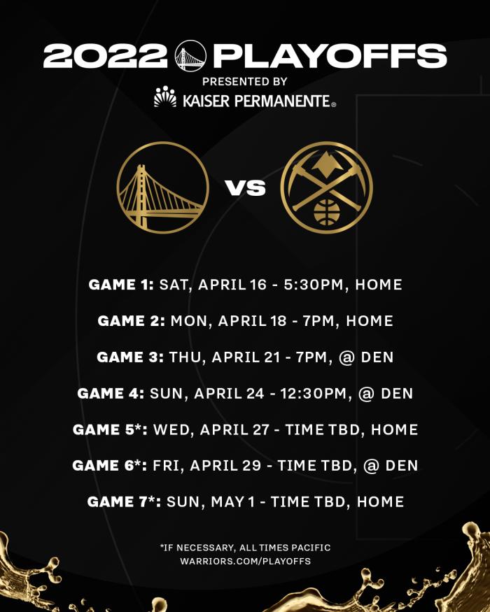 来源:JRS直播04-14 15:14JRS直播04月14日讯 ,勇士官方也发布了和掘金季后赛首轮的具体赛程——G1是当地时间4月16日下午5点30分,G2是4月18日下午7点,G1和G2都是勇士主场;G3和G4都在掘金主场,时间分别是4月21日下午7点和4月24日下午12点30分;若有必要的话,G5是4月27日回到勇士主场,G6是在4月29日掘金主场,G7是5月1日勇士主场。