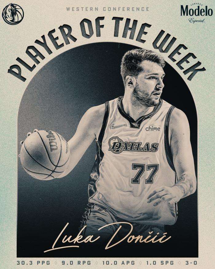 东契奇本赛季第3次夺得周最佳,生涯第7次当选,独行侠官方祝贺东契奇,配文写道:神奇的一周;本赛季东契奇场均拿到28.4分9.1篮板8.7助攻以及1.2次抢断和0.6盖帽,带领独行侠(52胜30负)以西部第四的身份晋级季后赛。