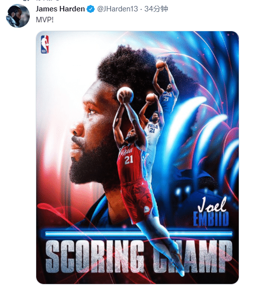NBA官宣!恩比德正式加冕得分王+再获周最佳,哈登发推高呼:MVP