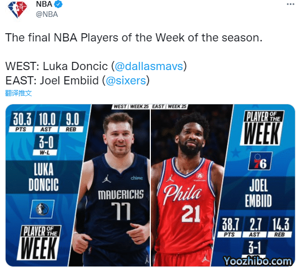 来源:JRS直播04-12 11:19JRS直播04月12日讯 ,NBA官方正式公布最后一周的东西部周最佳球员,恩比德和东契奇分别当选,NBA还官宣恩比德夺得得分王,哈登转发海报并且力挺恩比德MVP。