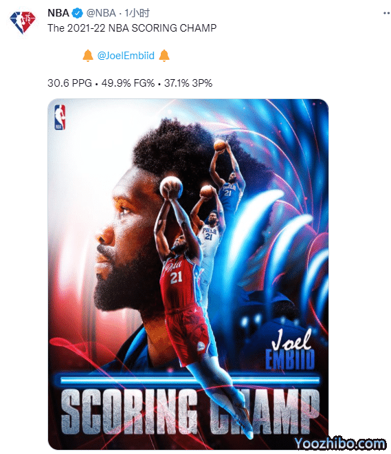 恩比德本赛季第2次当选东部周最佳,生涯第7次当选,76人官方盛赞:东方野兽;本赛季场均轰下30.6分11.7篮板4.2助攻1.5盖帽和1.1抢断,NBA官方还正式宣布恩比德当选2021-22赛季得分王,哈登转发恩比德加冕得分王,并且发推写道:MVP!