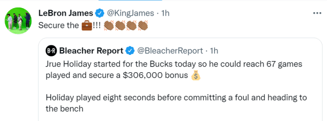 来源:JRS直播04-11 17:23JRS直播04月11日讯 ,雄鹿后卫霍乐迪今日首发,但他只打了8秒钟就故意犯规,被教练换下。这次象征性的出场,可以让霍乐迪的出战场数达到67场,确保他获得30.6万美元的奖金。詹姆斯转发这一新闻,看热闹拍手叫好:“钱已到手!”