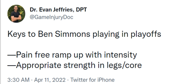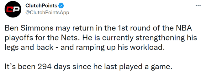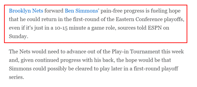 ESPN名记沃纳罗斯基跟进报道称,西蒙斯的背部已无疼痛感,这点燃了他在东部季后赛首轮回归的希望,就算他刚复出时只能打10-15分钟。