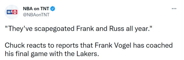 来源:JRS直播04-11 17:02JRS直播04月11日讯 ,湖人决定炒掉沃格尔,第一时间冲上了全美热搜榜的第一位。TNT节目上,名宿巴克利回应湖人的炒帅行动,他为沃格尔鸣不平,认为沃格尔和威少一整年都在背锅,是湖人的替罪羊。而头号詹黑斯基普-贝勒斯表示,沃格尔这么晚才下课,是湖人老板珍妮-巴斯在惩罚詹姆斯。