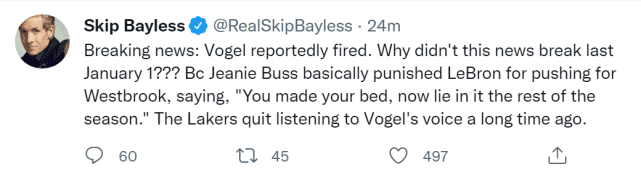 其实,沃格尔在赛季中期就曾接近下课, 但湖人高层突然又改变主意,让他执教到赛季结束。当时的说法是,他们认为赛季中期换帅,不会对战绩有实质性的影响。而被称为“头号詹黑”的斯基普-贝勒斯在社媒上给出了新的解读。