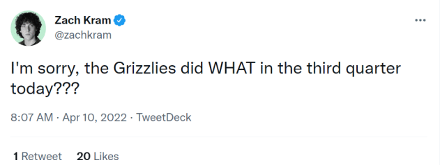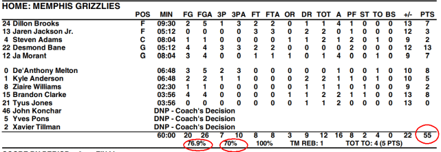 数据显示,灰熊在第三节得到55分,而鹈鹕得到33分,这一节,灰熊就赢了鹈鹕22分。灰熊在第三节投篮26中20,命中率76.9%,三分球10投7中,命中率70%!贝恩单节13分,4投4中,三分球3投3中!数据专家Zach Kram感慨道:“灰熊今天第三节都做了些什么???”