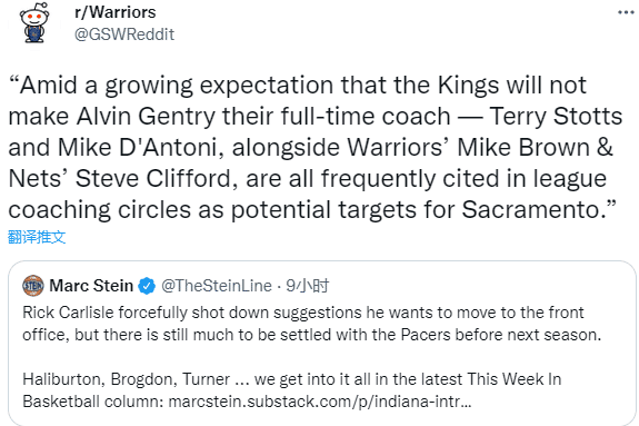 Marc Stein在文章中表示,很多人认为国王不会让球队的临时主教练金特里继续执教,目前国王的潜在新主帅人选有斯托茨、德安东尼、迈克-布朗(现勇士助教)和克利福德(现篮网顾问),国王正在寻找一名经验丰富的教练,希望能够带领球队进入季后赛。