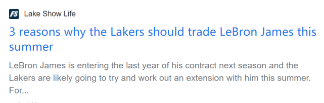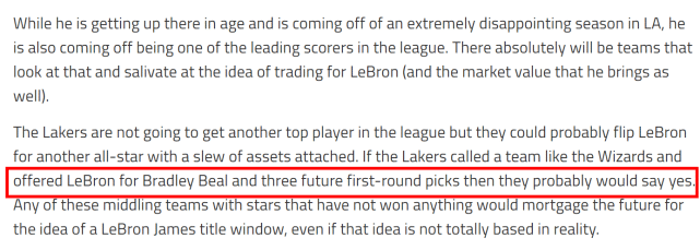 交易詹姆斯会让湖人下赛季变得更差,但(被詹姆斯用合同威胁)也是湖人不愿陷入的处境。他们肯定不想在未来几年为詹姆斯的一些决定付出代价。