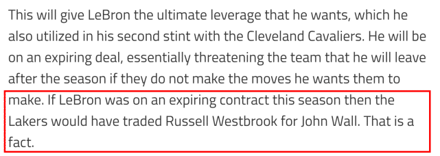2022-23赛季将是詹姆斯合同的最后一年,湖人很可能在今年夏天尝试和他提前续约。但对于詹姆斯本人来说,拒绝提前续约可能更有意义。因为这将为詹姆斯提供他想要的终极影响力,他在第二次效力骑士时也利用了这一点。当他合同快要到期时,基本上就是在威胁球队,如果他们不采取他希望球队采取的行动,他就将在赛季结束后离开。洛媒认为,假如本赛季就是詹姆斯的合同年,或许湖人已经答应用威少去换沃尔了。
