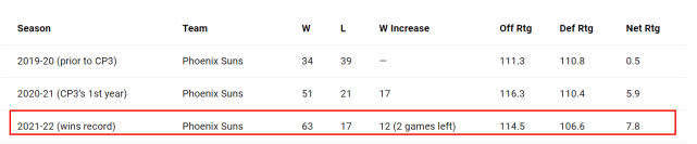 得到保罗前的一个赛季,太阳只打出34胜39负的战绩,保罗加盟的第一年,也就是2020-21赛季,太阳就打出51胜21负,多赢了17场球,他们的进攻从第12变成第7,防守从第17变成第6,自1993年以来首次打进总决赛。
