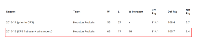 保罗加盟火箭,同样给这支球队带来新的提升,即便他们原本已经打出不错的战绩。保罗加盟前一年,也就是2016-17赛季,火箭55胜27负,而保罗加盟后,2017-18赛季,火箭65胜17负,多赢了10场球,创队史最佳战绩。这一年,火箭的进攻效率达到114.1,联盟第一,净效率值8.4,同样是联盟第一。
