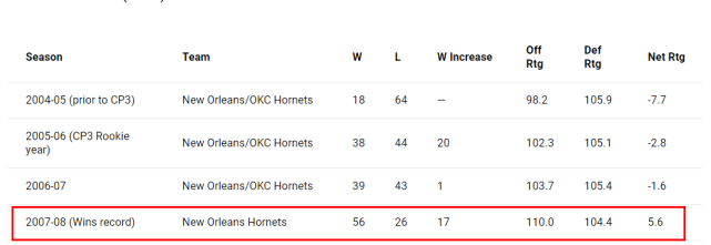 2005-06赛季,保罗在新秀年就帮助黄蜂取得38胜,比之前一季多赢了20场球。2006-07赛季,保罗的黄蜂保持稳定,拿到39胜。2007-08赛季,进入生涯第三季的保罗率领黄蜂打出队史最佳战绩:56胜26负,比前一年多赢了17场。他们的进攻效率是110.0,防守效率104.4,百回合赢对手5.6分。那一年,保罗场均11.6助攻和2.7次抢断,助攻和抢断都排名联盟第一。