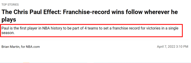 数据显示,保罗先后帮助黄蜂、快船、火箭和太阳打出了队史最佳战绩,而在NBA历史上,他是第一个拥有该项成就的球员!