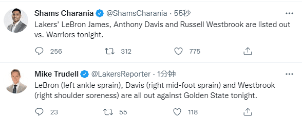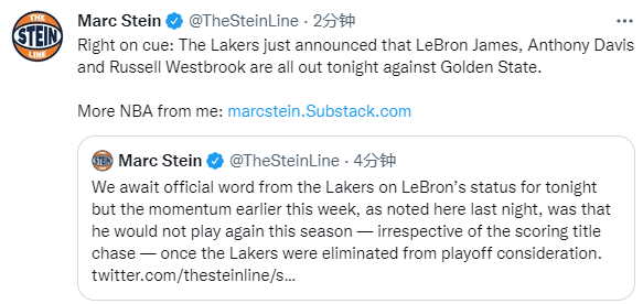 来源:JRS直播04-08 15:54JRS直播04月08日讯 ,洛杉矶湖人队官方正式宣布,詹姆斯(左脚踝扭伤)、浓眉(中足扭伤)和威少(右肩酸痛)三巨头都因伤缺战勇士;随后名记MarcStein确认,随着湖人正式无缘附加赛,詹姆斯本赛季不会再次上场,提前放弃争夺得分王。