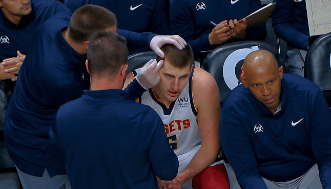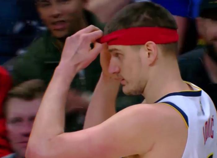 意外!约基奇头部惨遭肘击血流不止,止血治疗后戴红色发带出战