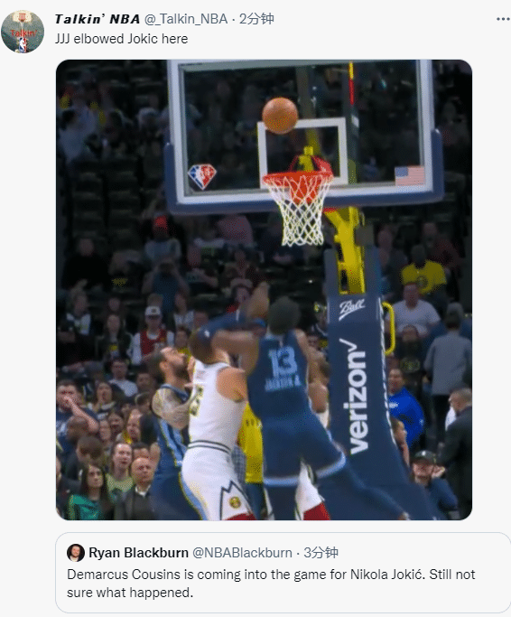 第一节11分09秒,比赛才打了51秒,约基奇在抢篮板时惨遭小贾伦-杰克逊肘击到头部,约基奇头部流血,明显感到不适,下场时用毛巾捂着伤处,鲜血染红了毛巾;掘金安排考辛斯顶替约基奇上场;掘金队医为约基奇止血并且治疗,过了几分钟后重新上场。