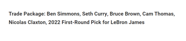 当然,这只是Fadeaway World提议的一个交易方案。进入休赛期,詹姆斯没有和湖人正式续约前,关于他的流言一定会继续传来。就在今天,詹姆斯表示自己最想联手的现役球员是库里,马上就有美媒支招勇士选秀挑布朗尼,然后吸引詹姆斯来投,打造新的宇宙勇。