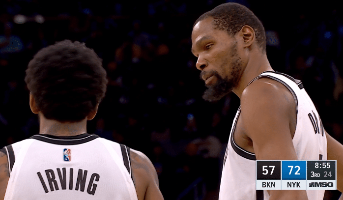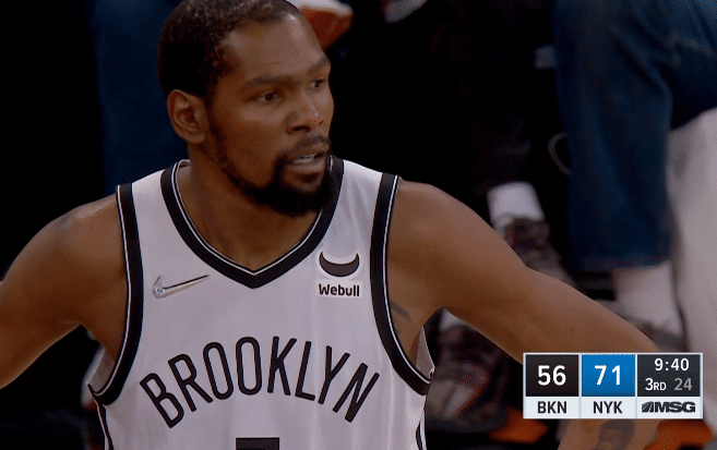 下半场,尼克斯第三节进攻明显下滑,虽然欧文单节7投1中仅拿到2分,但杜兰特找回状态,外线三分开火,打单节拿到10分,篮网22-15追回7分。落后10分进入末节。