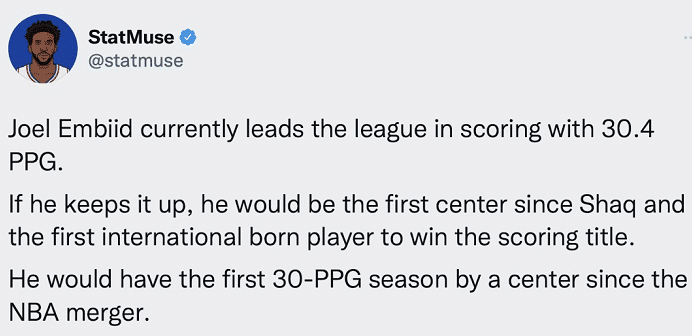 第三,如果恩比德拿到得分王,他将成为NBA76年历史上首位拿到得分王头衔的海外球员。