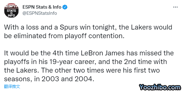 若湖人今天输球且马刺赢球,湖人就会彻底无缘附加赛和季后赛,这将是詹姆斯19年生涯第4次无缘季后赛,湖人生涯第2次,另外两次是詹姆斯为骑士效力的前两个赛季。