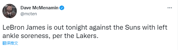 湖人客场对阵太阳之前,名记Dave McMenamin报道,詹姆斯因左脚踝酸痛而缺席今天的比赛,浓眉则是继续带伤出战;詹姆斯因伤缺战太阳,湖人最快今天正式无缘附加赛,这也就意味着湖人的赛季就要提前结束了。
