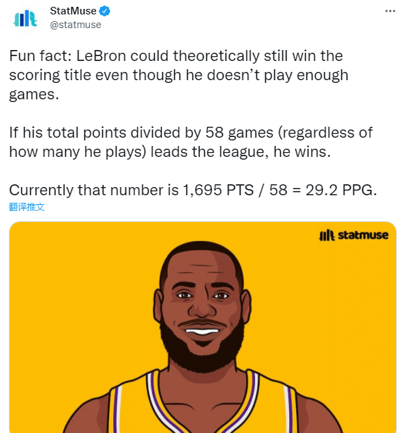 湖人的附加赛希望渺茫,詹姆斯冲击得分王的难度也很大,若詹复出对阵雷霆并且至少拿到57分,或者最后3场再打2场并且疯狂砍分,他才有望成为史上最年老得分王。