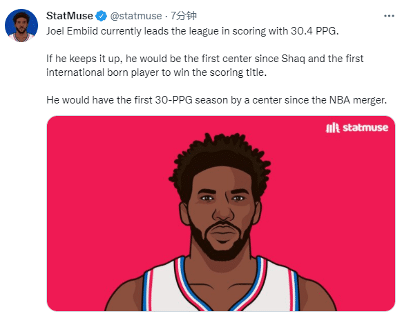 恩比德场均30.4分升到联盟第一,还将冲击三大纪录——若恩比德保持这样的场均得分,他将成为奥尼尔之后第一位获得得分王的中锋,也将成为史上第一位夺得得分王的国际球员,也将成为NBA合并以来,第一位场均30+的中锋。