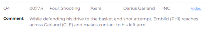 在比赛还剩17.4秒时,76人107-106领先骑士1分,加兰突破上篮,恩比德防守时打到加兰的手臂,当时裁判没有任何吹罚,这是一次关键漏判,加兰本该获得两次罚球;若加兰两罚全中,骑士将反超比分。