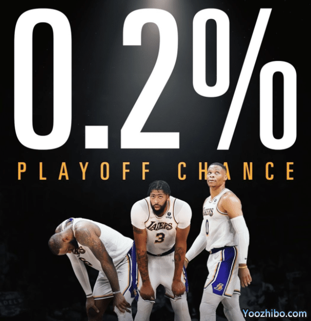 湖人常规赛还剩下最后4场比赛,落后西部第十的马刺(33胜45负)2个胜场,湖人晋级附加赛的概率仅有6.1%,晋级季后赛概率更是只有扎心的0.2%。