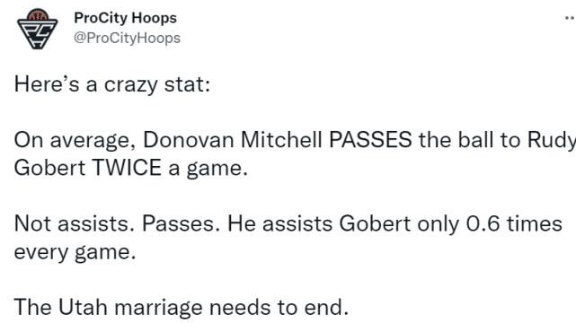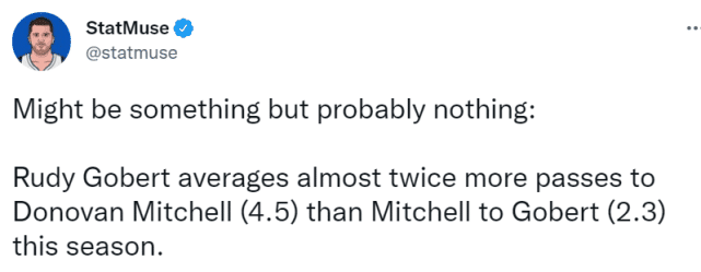 美媒指出,若是算助攻,米切尔场均只给戈贝尔送出0.6次助攻,这实在是太少了,犹他的这段“婚姻”该结束了!美媒StatMuse进一步更新数据,米切尔场均给戈贝尔传2.3次球,而戈贝尔场均还给米切尔传了4.5次球。