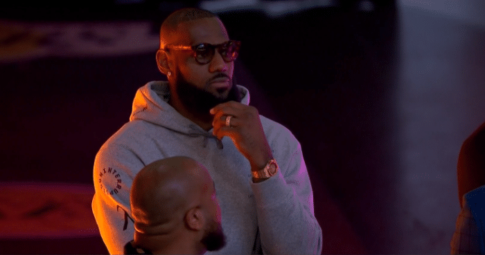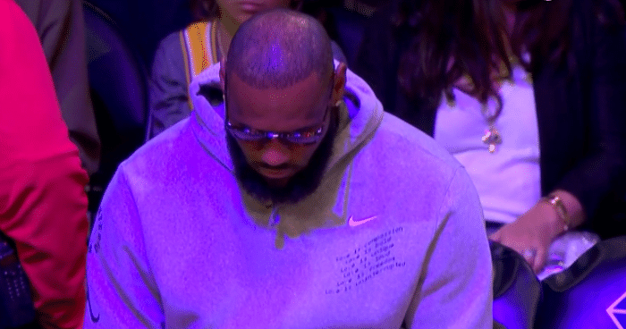 湖人球迷纷纷提前离场太沮丧,詹姆斯坐在场边,低头不语也很无奈。