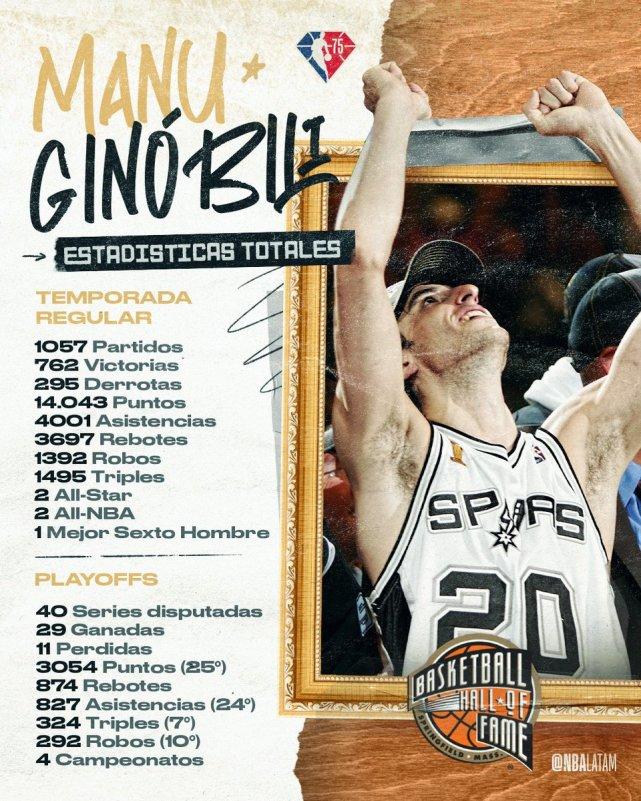 吉诺比利曾两次入选 NBA 全明星赛(2005 年、2011 年),四次帮助马刺获得 NBA 冠军(2003 年、2005 年、2007 年、2014 年)。在他效力于马刺队的 16 年 NBA 职业生涯中,这位阿根廷后卫积累了 14,043 分、4,001 次助攻、3,697 个篮板和 1,392 次抢断,并在2008年获得NBA年度最佳第六人奖项,两次入选NBA最佳阵容第三阵容(2008、2011)。国际舞台上,吉诺比利在2004年奥运会上帮助阿根廷夺得金牌,2008年奥运会上获得铜牌。他与比尔-布拉德利一起成为仅有的两名获得过欧洲联赛冠军、NBA总冠军和奥运会金牌的球员。