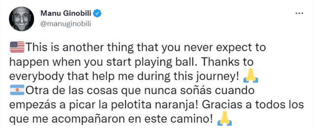 马刺官方晒照祝贺吉诺比利当选,吉诺比利本人也用英语和西班牙语发文致谢:“从你开始打球起,这是另一件你从未预料会发生的事。感谢这段旅程中所有帮助过的人。”在接受采访时,吉诺比利说:“我从来都没拿过得分王,没得过MVP,甚至连一阵都没进过。我能达成如今的成就,是因为我的环境,我并肩作战的队友们,教导我的教练们以及我效力的球队。”