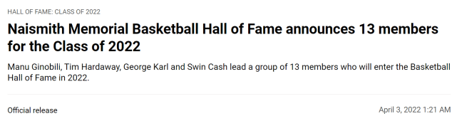 官宣!2022年篮球名人堂13人名单出炉 吉诺比利双语发文致谢